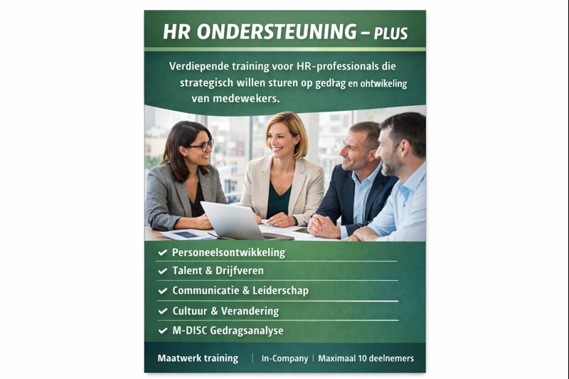 Verdiepende training en ondersteuning voor HR-professionals die strategisch willen sturen op gedrag, communicatie, inzet en ontwikkeling van medewerkers. Maximaal 10 deelnemers per groep.