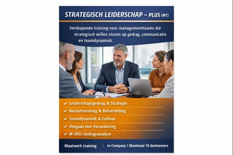 De PLUS‑variant bouwt hierop voort met een langere trainingsduur, uitgebreidere intake en verdieping met M‑DISC (inclusief teamwiel, stressgedrag en situationeel leiderschap per profiel). Hierdoor is de PLUS‑training met name geschikt voor leidinggevenden die hun impact verder willen vergroten en duurzaam willen sturen op gedrag, communicatie en samenwerking.